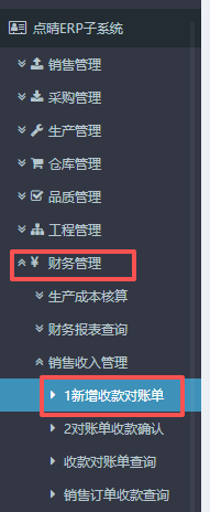 :点晴ERP-收款对账单流程 1.进入ERP系统之后,在左侧的功能菜单里找到“财务管理”,点开“销售收入管理”,点击“新增收款对账单”。 2.点击进入页面之后,选择收货单位,点击查询。 3.查询之后,在下方会得出对应的收款对账单,确认对账单价以及收货数量、待收款,点击确认复核和收款,最后点击提交。 ...