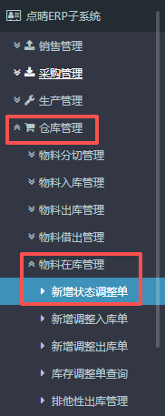 1.进入ERP系统之后,在左侧的功能菜单里找到“仓库管理”,点开“物料在库管理”,点击“新增物料状态调整单”。