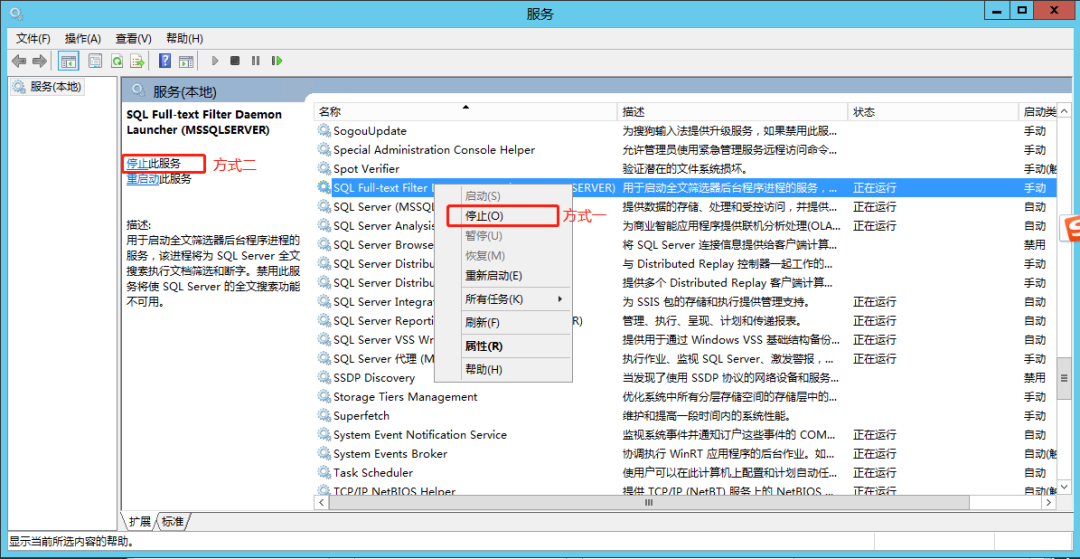 找到所有 SQL Server 的服务并全部停止 (不同的版本可能会有区别)