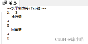 除了CHAR(9)Tab空格,其他的特殊字符空格还有CHAR(10)换行和CHAR(13)回车,在数据库中显示都是空格,看不出差别,我们可以用PRINT输出看出对比:
