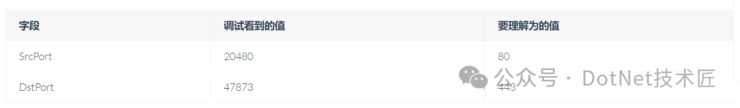 同时WinDivert还提供了完整的loopback(回环)IP、IPv6的支持,简约而强大的Api、高级别的过滤语言(可以想象为sql一样的东西)。 如此优秀的项目自然有着各个语言的二次封装项目,我在github上也找到了对应多个的dotnet封装项目,但无一例外,他们封装的比较简陋或太过于简陋,下面是封装项目的一些不足之处: 1、IPHeader、TcpHeader、UdpHeader等未提供网络和主机的Endian转换 2、局限于PInvoke,没有意识使用dotnet的对象(比如IPv4直接声明为uint类型) 3、没有面向对象的封装,甚至简陋到只有声明了static的PInvoke方法 4、过滤语言没有任何处理,使用时要翻阅WinDivert的文档(写手sql一个感觉) 5、没有异步IO封装,都是清一色的IO同步阻塞(异步IO封装难度大) WindivertDotnet介绍 WindivertDotnet是面向对象的WinDivert的dotnet异步封装,其保持着完整的底层库能力,又提供dotnet的完美语法来操作: Filter对象支持Lambda构建filter language,脱离字符串的苦海; 内存安全的WinDivert对象,基于IOCP的ValueTask异步发送与接收方法; 内存安全的WinDivertPacket对象,提供获取包有效数据长度、解包、重构chucksums等; WinDivertParseResult提供对解包的数据进行精细修改,修改后对WinDivertPacket直接生效; 2.1、网络和主机的Endian自动转换 由于windows平台是LittleEndian,而标准的IPHeader、TcpHeader、UdpHeader网络定义都是BigEndian,如果未做任何处理,当接收到一个SrcPort为80、DstPort为443的Tcp包时映射为结构体时,你调式会看到如下结果: