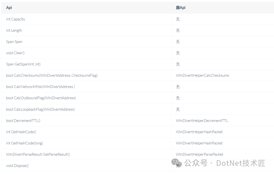 由于没有做Endian自动转换,在调试时看到的数据甚至让人抓狂,此时如果你把SrcPort改为我们理解为81端口,你是不能直接写 WindivertDotnet项目花了很大的时间精力,为所有涉及的结构体字段访问时都做了必要的Endian读取和写入自动转换,让调用者不再为Endian问题费脑子。 2.2、结合使用dotnet类型 IPv4地址占用4字节,IPv6地址占用16字节,所以一些封装项目直接在结构体声明为 WindivertDotnet在声明字段类型时,当存在对应的dotnet高级类型时,优先使用这些高级类型,除了 2.3、面向对象的封装 WindivertDotnet将零散的过程式c-api,包装为多种对象,而不是让你面对满天飞的各种静态方法PInvoke调用IntPrt句柄和维护这些句柄的生命周期,例如WinDivertPacket对象,其本质是一个非托管的缓冲区内存,在没有封装之前,它就是一个csharp的