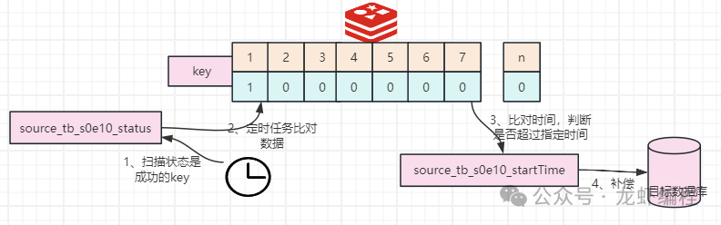 为了保存数据迁移中不被遗漏,我们可以采用定时做补偿机制,原理是通过扫描Redis中分组迁移状态是key(如source_tb_s1e10_status)是成功状态,如下所示: