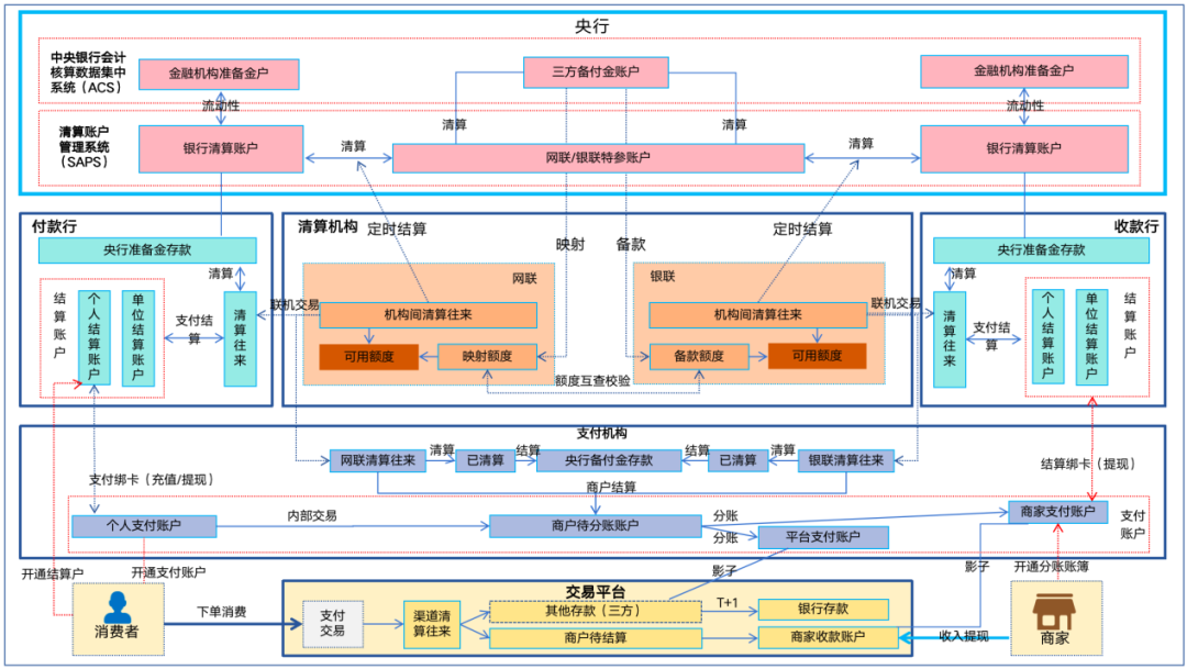 央行的账户与支付比较密切的就是三方备付金账户以及银行和网银联的清算账户,跨机构支付清算在这些账户之间完成最终的资金清算。