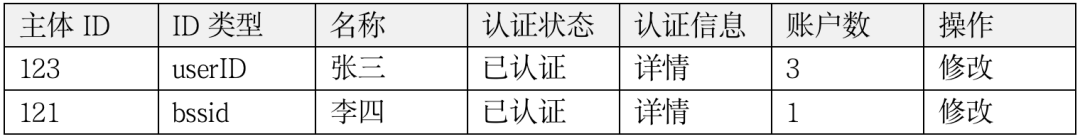 怎么管理这些主体呢?一个平台的各主体信息一般是放在用户中心,用户中心去调用账户中心为主体开通相应的账户。用户中心存储着主体的基本信息,比如ID信息、属性信息、权限信息、关系信息等。要新增信息就增加字段即可,也可以将信息进行分类,每一类记录到不同的表中,比如身份信息、认证信息、账户开通信息等,如下表所示。