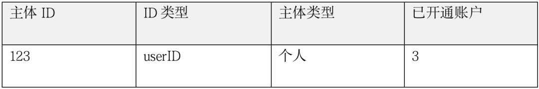 在创建主体的同时就需要定义每一类主体的唯一识别ID。在开户的时候,需要使用这个唯一识别ID作为账户主体的唯一识标识。个人的唯一ID可以是身份证,在开银行卡的时候就是用的身份证ID作为个人的唯一识别ID,在办理社保的时候也是用身份证ID作为身份的唯一识别ID;唯一ID的条件就是能够唯一识别这个主体,其中:个人的唯一ID可以是身份证、手机号、社保号、一个平台的userID,其他的在这个平台的唯一ID;企业的唯一ID可以是统一社会信用编号,也可以是对公户的卡号等;如果企业入驻了一个平台,那么这个平台为这个企业生成的企业编码也可以唯一识别这个企业。唯一ID的用途是唯一识别这个主体,但有时候可能这个主体的唯一身份ID不够用,比如这个人在淘宝即是个人用户又是商家用户,那么他在开户时可能就不能只用身份证了,而是用个人身份的userID  和商户身份的 bussid。