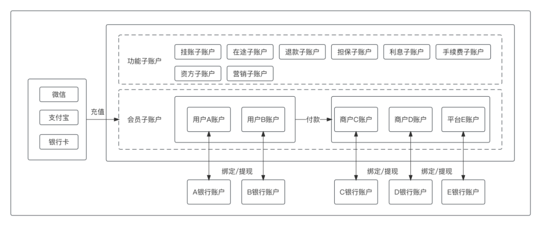 支付账户可以分为个人支付账户和企业支付账户;该账户实际上是一种虚拟记账账户,真实的资金存放在央行。企业支付账户多是用于登记其商户的代收预付的款项,最终会结算至企业绑定的同名银行单位结算账户中。个人支付账户主要是用于零售消费使用,可以通过绑定的个人银行结算户进行资金充值,同样也是一个虚拟记账账户,真实的资金也存放支付机构在央行的备付金账户中。