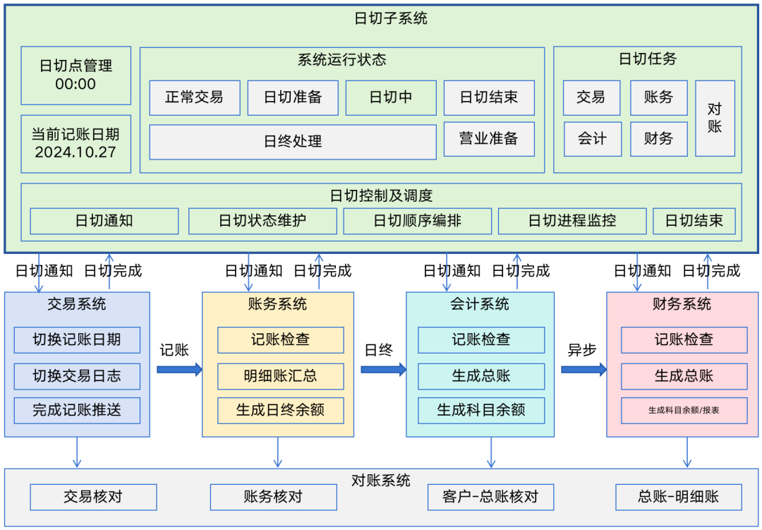 所有相关的外围系统,例如交易系统、支付系统、清结算系统等本书前面章节均做了详细的解析,将“各业务系统,业务系统产生的记账种类,账务核心”等内容整理到一张架构图中来阐明这种浑然一体的全局关系。