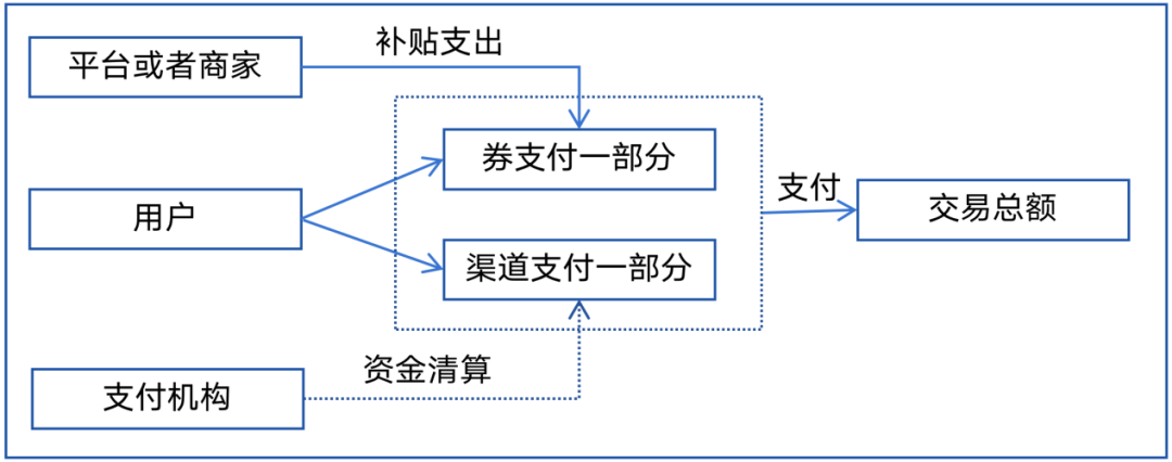 如果这张优惠券不是平台免费发放给用户的,而是用户自己花钱买的,例如用户花5元买了一张20元的平台优惠券,交易逻辑如图所示。