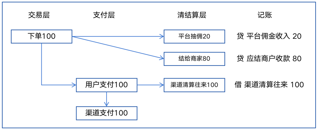 如果一笔订单100元,用户支付成功了100元,那记账就很简单了,交易=支付,用户支付的钱也就是后面要清结算的总量,最后结算给商家80以及平台抽一部分佣金20,这也是最基础的账务处理,如图图一所示。会计分录如下图二所示。