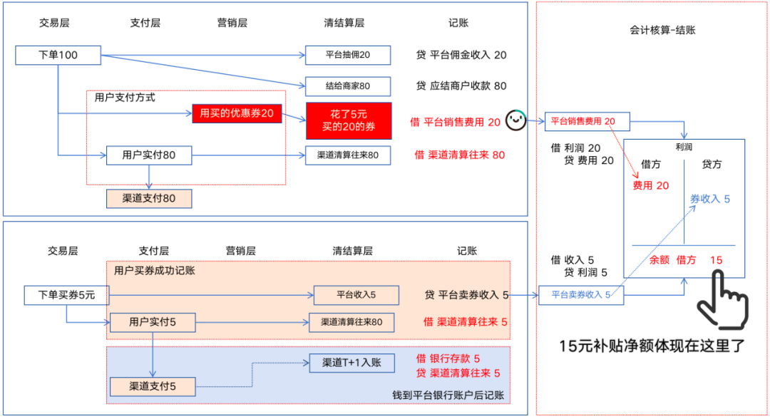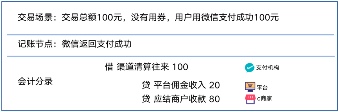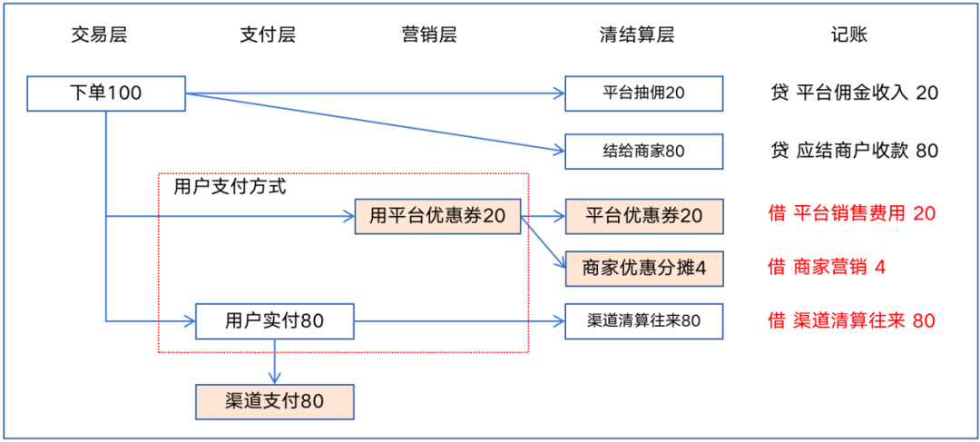 如果一笔订单100元,用户用了一张20元商家券,渠道实际支付80元,账务处理如下图所示。