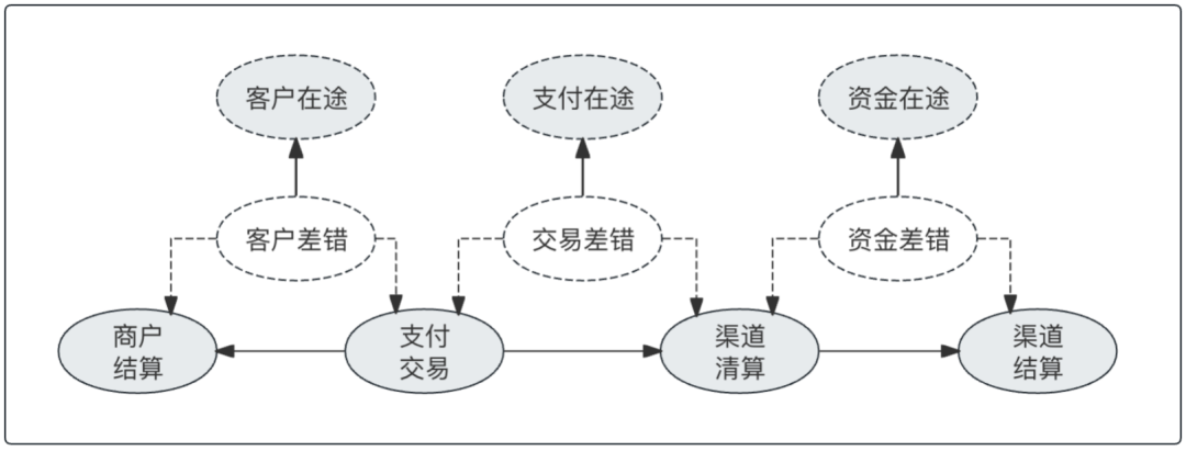 • 三套差错:三组核对就形成了三组差异数据,分别构成了各类在途,差错处理就是抹平在途,由此完成了全业务链路的清结算业务。