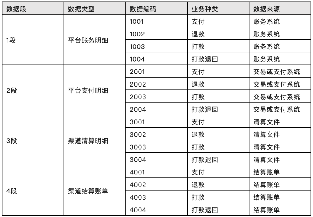 无论是交易还是支付,或者是对账、渠道清算、结算,都离不开各类数据,可以将全链路的最原始数据分成四类,分别是:账务数据、支付数据、清算数据、结算数据。并分别定义为1段数据、2段数据、3段数据、4段数据,如表所示。