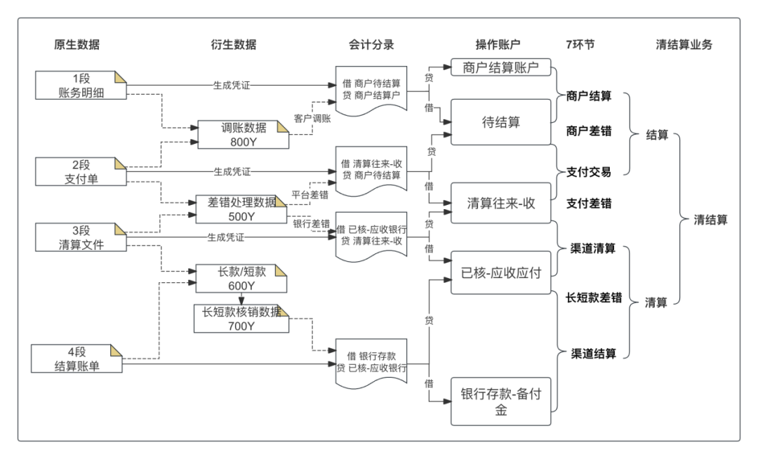 将所有数据段以及核对差异产生的差错处理数据的账务处理关系绘制出来,就得到了如下图所示的,各段数据源与账务核心的账务处理关系。