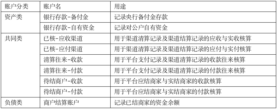 清结算业务离不开账务和账户,为此,需要设置一套账户,为支付交易和清结算等业务提供账务支持。设置的账户及用途如表所示。