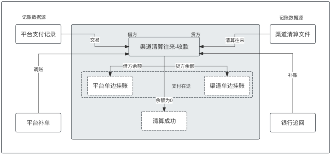 交易驱动账务进行记账,以支付数据为记账数据,借记渠道清算往来,贷记待结算商户