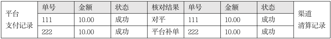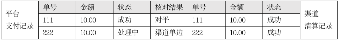 对账中心获取到渠道清算文件以后,与平台记录进行核对,渠道清算成功了2笔,因此核对结果如下表所示,出现了一笔渠道单边。