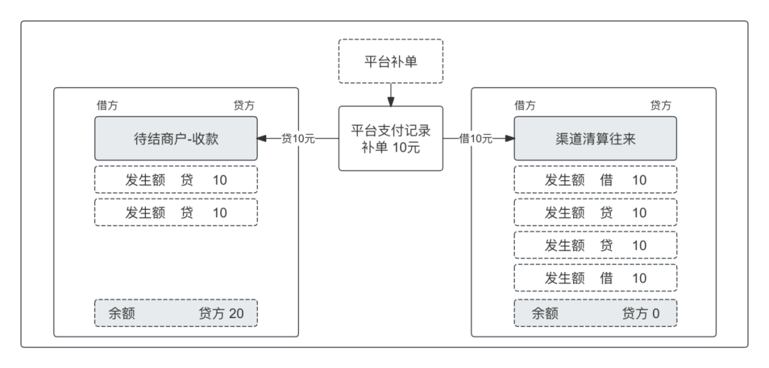补单成功的支付记录将驱动账务再次记账,因为平台补单的数据属于平台支付记录,因此,其账务处理规则与平台支付记录的账务处理规则相同