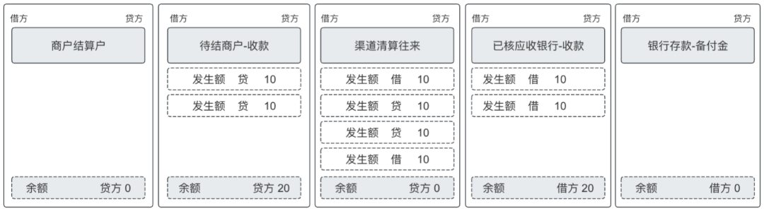 可以看出通过这5组账户的借贷账务处理,完成了从交易到内外清结算的全链路核算以及最后的记账,中间过渡户的最终余额为0,代表着完成了渠道的清算往来核算以及商户的结算核算。通过该账户体系可以非常高效和准确的实战清结算业务的全局处理。