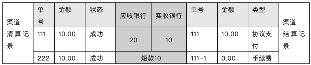 资金对账模块获取到银行结算账单以后,进行资金对账,假设渠道结算文件记录只有一笔,因此在资金对账时出现了短款