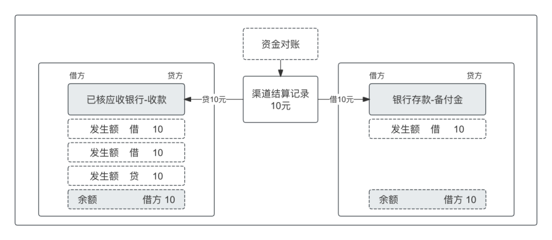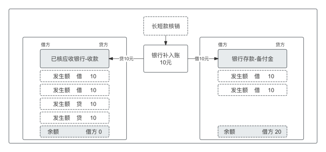 当余额不为零时,则意味着存在平台单边或者银行单边,单边数据在交易对账中心,可以通过相应的差错处理抹平差异。例如银行单边,则要不进行平台补单,要不进行银行退款,或者平台确认收入,这部分差错处理也会操作该账户,进而抹平账户的余额,完成最终核算。