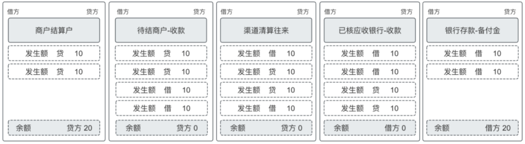 从图中可以看出来,此时待结算商户20元,与渠道清算成功,应收渠道20元,商户结算户和银行存款户还没有余额。
