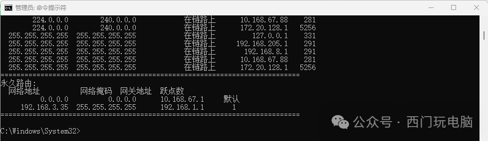 5)、如果想删除上面加的第一条(192.168.2.0)路由的话,可以使用命令:我们来看一下是否删掉了这条路由,用route print命令:6)、把内网地址段和IP地址都可以用这条命令加到路由表里面,这样内网的IP地址会通过固定路由表内的路由转发到内网192.168.1.1的网关这里。其余不在固定路由表内的IP地址或IP地址段都会通过外网的网关转发。可以利用添加到固定路由表里面的路由的优先级高这一点,如果访问的内网的IP地址,会优先从内网的网关出去,其余不在固定路由表的IP地址会通过外网的网关转发。这样就能够实现内外网走不同的网关出去,可以实现既可以访问内网,也可以访问外网。注意:不加-p参数的话重启电脑之后,路由就不会生效了,可以通过route print来查看路由表内的内容。