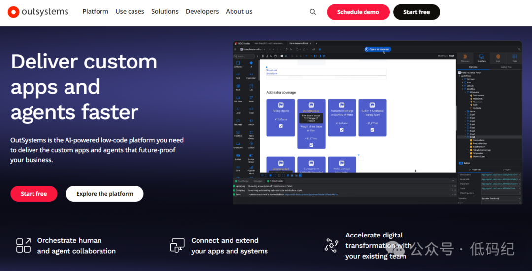 • OutSystems:“速度最快的低代码平台”。OutSystems 的特点是 “快”—— 不仅开发快,运行也快。它的预制模块非常丰富,支持复杂的业务逻辑,还能和各种企业级系统对接(比如 SAP、Oracle、Salesforce)。