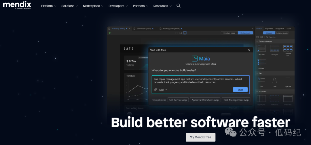 • Mendix:“最懂业务的低代码平台”。Mendix 有一句广告词,我特别认同:“让业务人员和 IT 人员一起创造价值”。它的平台设计很人性化,业务人员和 IT 人员能在同一个平台上协作 —— 业务人员画流程、搭界面,IT 人员写核心逻辑、做系统对接,效率很高。