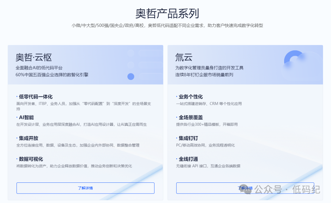 • 奥哲则是低代码领域的资深玩家,旗下拥有氚云、奥哲·云枢等多款产品,覆盖了从中小企业到大型企业的不同需求。奥哲的核心优势在于其强大的业务流程管理能力,能够帮助企业快速构建复杂的业务流程应用。