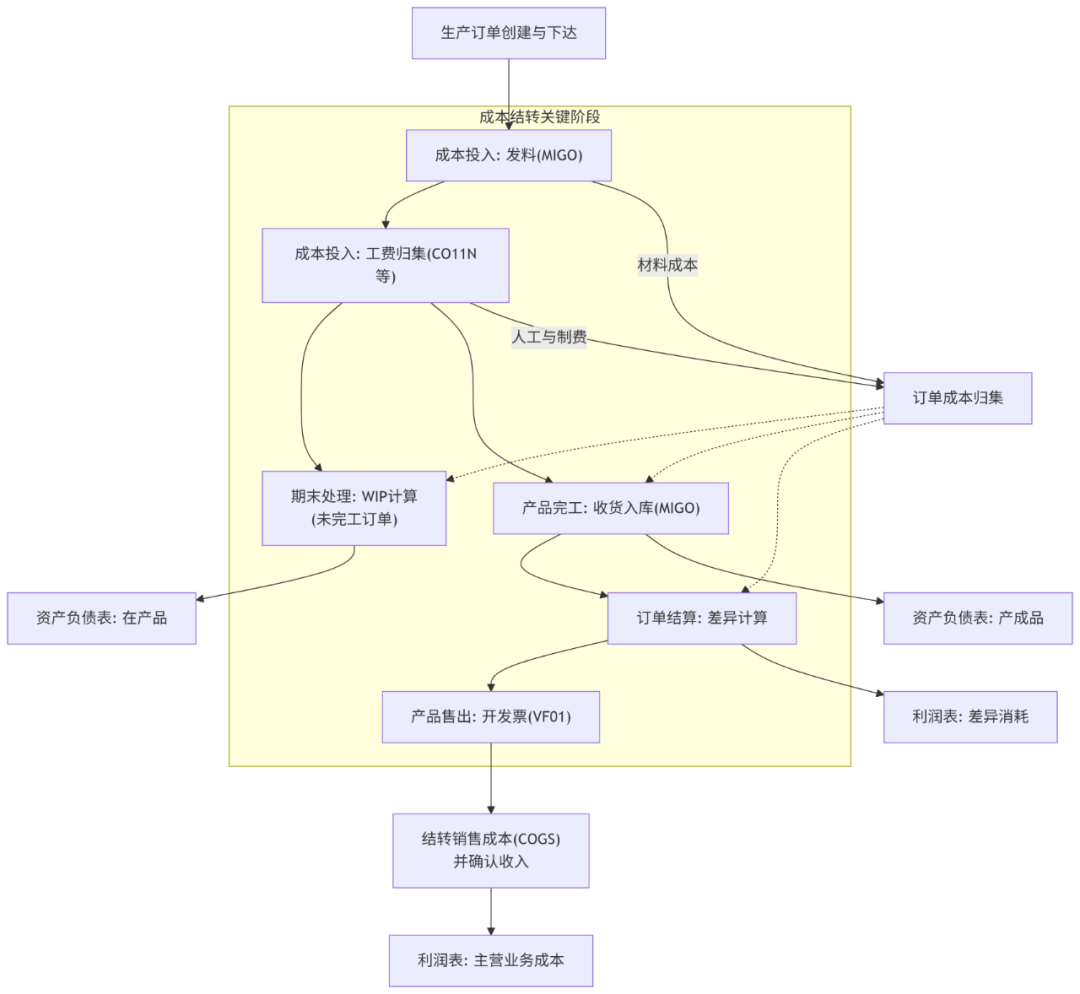 SAP的成本结转流程可以概括为:**成本伴随实物流动而结转**。其核心思想是:成本先被归集和对象化(到订单、到产品),然后随着物料的移动(收货、发货)而自动结转。 整个流程围绕着**生产订单(Production Order)** 的生命周期展开,如下图所示,它清晰地展示了成本从投入、归集到最终结转的完整路径: