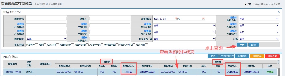 点击查询后,在下方物料信息里可看到调整前后质量状态