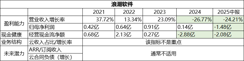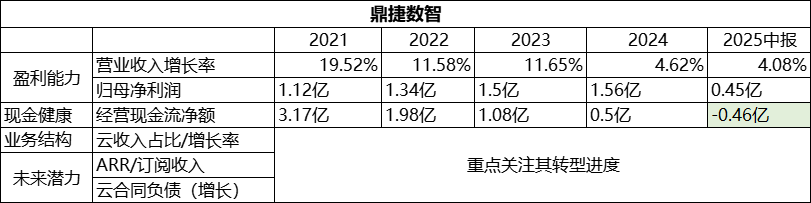 1、增长放缓,但盈利坚实。 营收增速从近20%平滑放缓至个位数,是动力缺失?还是深耕制造业细分领域的战略定力?可能都有。但纵观近五年,可以肯定的是,鼎捷没有追逐SaaS风口、没用亏损换规模;而当下的AI追逐,是产品定位层面更好的服务客户市场。难得的是,连续五年稳定盈利,在行业一片亏损中堪称异类,这证明了其业务模式的内生性健康和极强的客户粘性。 2、现金流趋势:一个关键的警示信号! 鼎捷的经营现金流从3亿多下滑至负值,这与稳定的净利润形成了反差,意味着为维持增长,在客户信用账期或项目垫资上做出了让步,或是项目回款周期变长(交付质量?)。这是鼎捷模式面临的核心挑战:在不大幅增加风险的前提下,增长天花板清晰可见。 写在后面: 鼎捷的选择揭示了行业另一种真相:并非所有企业软件公司都必须转型为平台型SaaS。其路径是 “软件+服务”的深度捆绑,而非“订阅+生态”的广度扩张。鼎捷吃透了制造业流程复杂、替换成本高的特点,做深、做透、成为客户身边不可或缺的老师傅。这种路径的优势是风险极低、盈利稳定;但代价是估值想象空间有限,增长受限。(当然,雅典娜和AI,可能也是鼎捷规避这种弊端的路径选择) 近五年鼎捷的财报数据证明,它是一家清醒的“手艺人”企业,在巨头鏖战的夹缝中,依靠专业主义和盈利纪律,同样能活得很好。但它也面临“手艺人”的经典困局:如何在不破坏这份“好”的前提下,变得“更大”?它的下一步抉择,将决定其是成为一家值得尊敬的“隐形冠军”,还是一家增长见顶的“传统企业”! 对于鼎捷出身的我,由衷期望老东家可以不忘初心,蒸蒸日上! 四、近五年财报看浪潮:项目制软件公司的“挣扎图景”。
