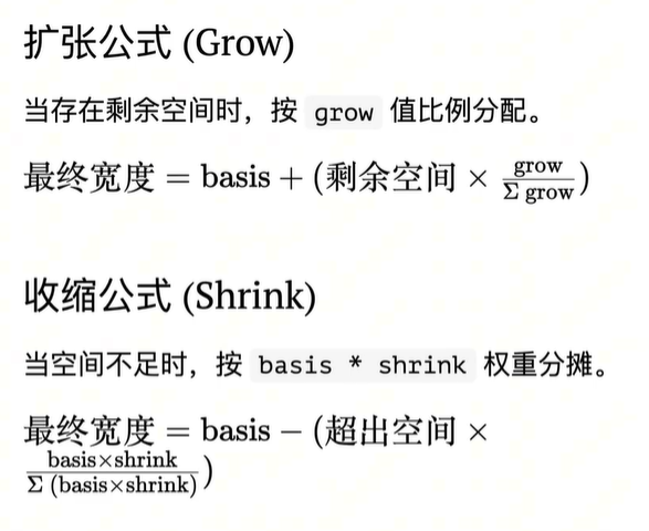• 空间不足时,压缩空间:系统根据flex-basis和flex-shrink共同决定的权重分梭压缩量
