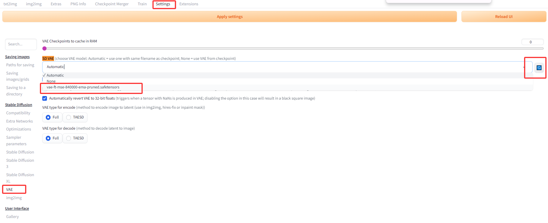 3. 在右侧的选项中,找到一个叫做 SD VAE 的下拉菜单。