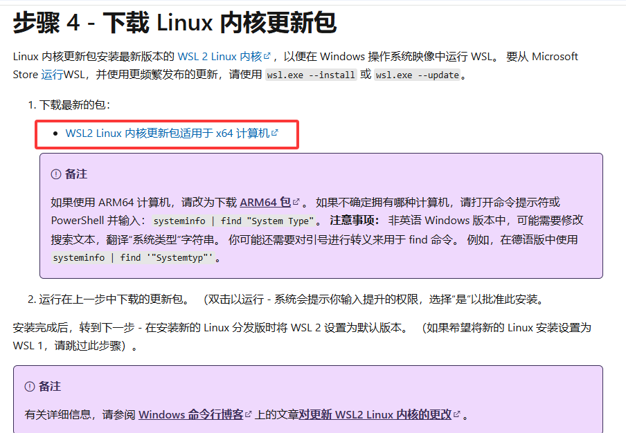 在Windows 10上如果默认版本是WSL1,可以手动下载更新包对其升级,如下图所示: