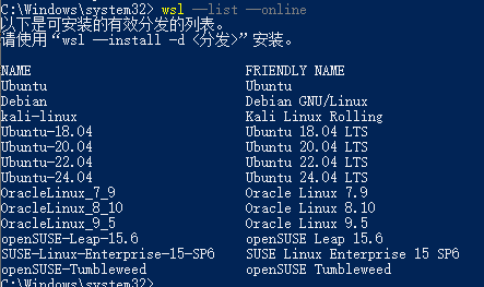 wsl --list --online:列出可用的Linux分发版。