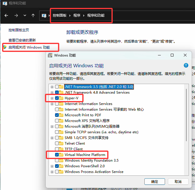 勾选Hyper-V、虚拟机平台、适用于 Linux 的 Windows 子系统。