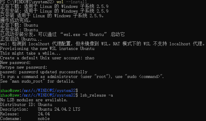 运行“wsl --install”即可安装默认版本,如下图所示: