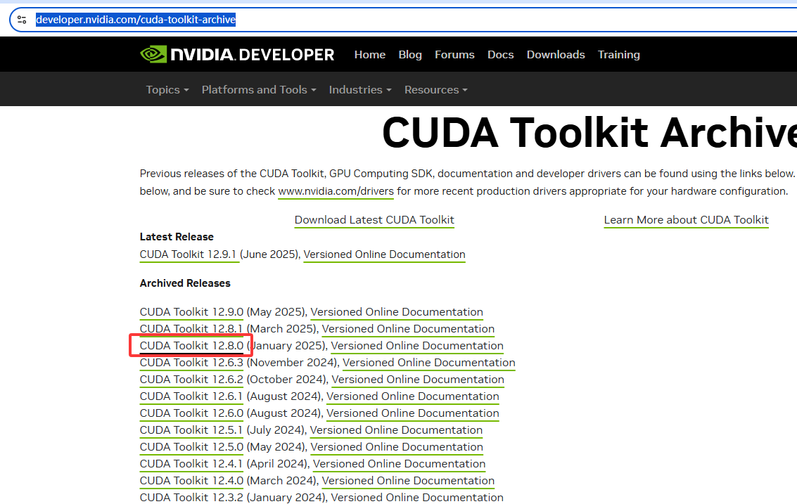 需要说明的是由于Nvidia可能会调整具体包的子版本号,导致以上部分链接可能失效,这时要在https://developer.nvidia.com/cuda-toolkit-archive页面自行选择适合自己的版本: