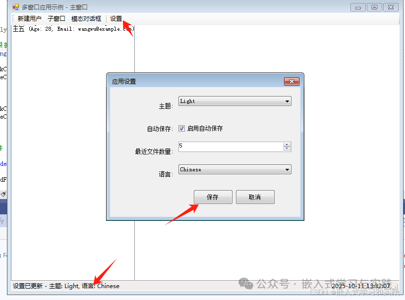 using System;using System.Collections.Generic;using System.Linq;using System.Text;using System.Threading.Tasks;namespace MultiWindowApp.Models{    // 用户数据模型    public class UserData    {        public string Name { getset; }        public int Age { getset; }        public string Email { getset; }        public DateTime CreatedAt { getset; } = DateTime.Now;        public override string ToString()        {            return $"{Name} (Age: {Age}, Email: {Email})";        }    }    // 应用设置    public class AppSettings    {        public string Theme { getset; } = "Light";        public bool AutoSave { getset; } = true;        public int MaxRecentFiles { getset; } = 5;        public string Language { getset; } = "Chinese";    }}