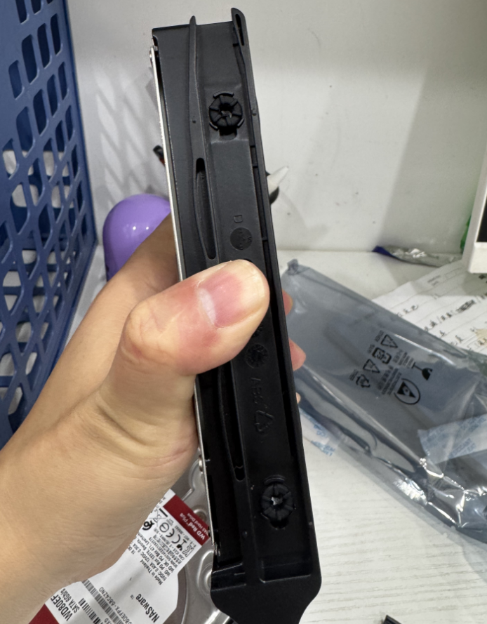 3.5寸硬盘,是通过两边的卡扣固定,如果是2.5寸硬盘,就是通过底部螺丝固定。
