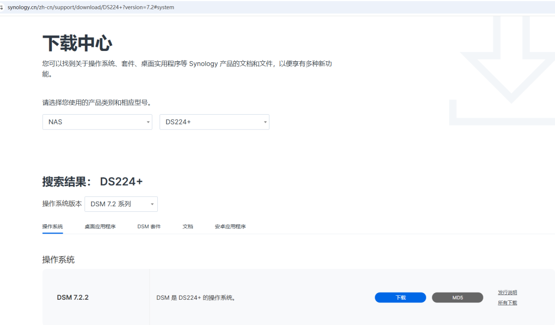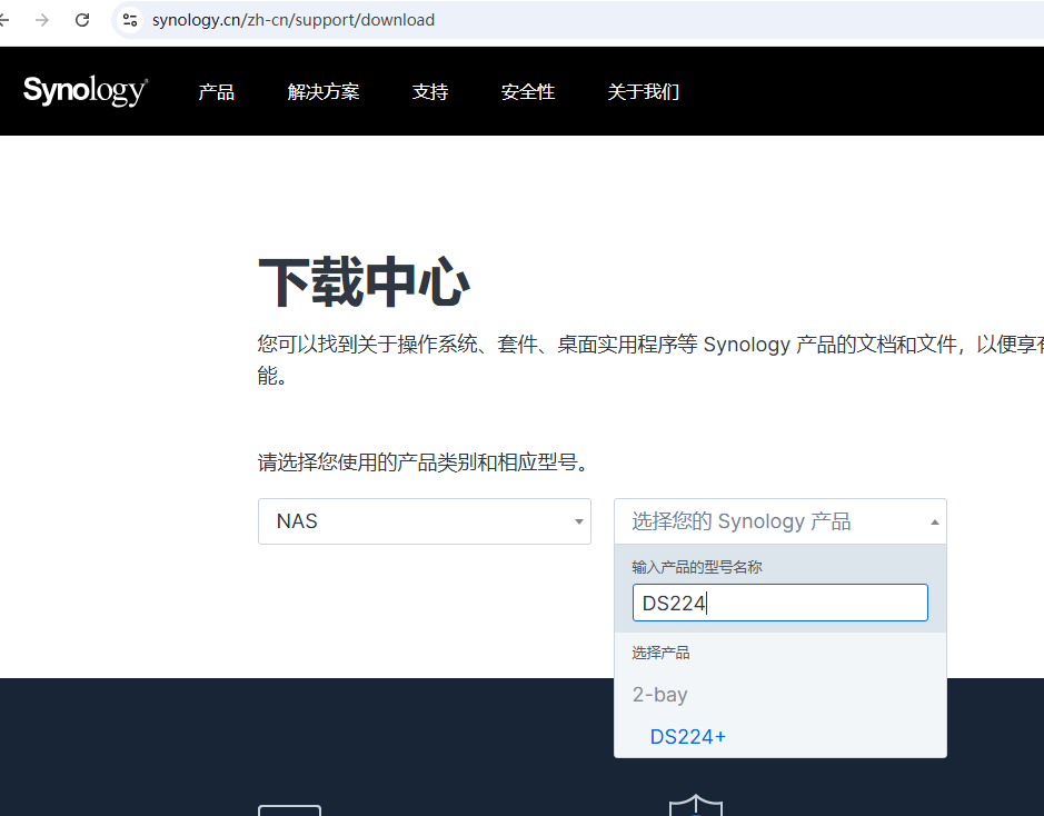 这时我们需要找一台电脑,和NAS设备连接在同一个局域网,然后打开官方网站。选择NAS产品,型号选择DS224+。