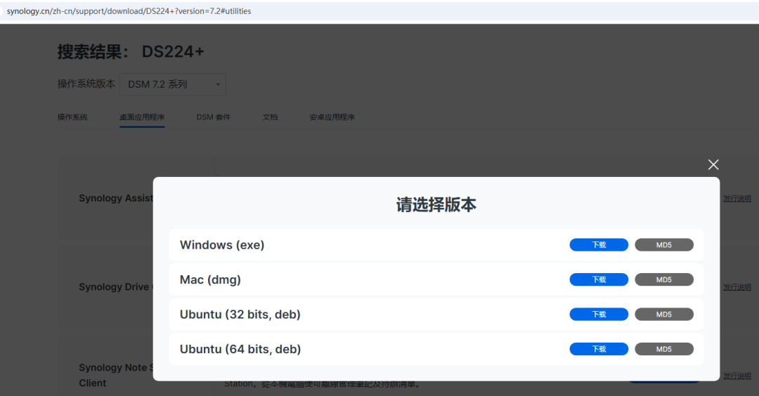 我们不需要下载这个DSM7.2.2操作系统到电脑,我们直接,选择桌面应用程序。找到Synology Assistant群辉助手软件。