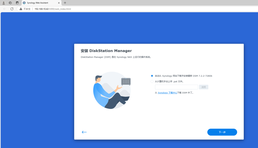 安装系统有两种方式,第一种就是下载好NAS的系统,直接上传进行安装,第二种方法就是自动从Synology网站下载安装最新DSM 7.2.2-72806版本。因为我们没有下载操作系统,所以我们直接选择第一个,从Synology网站下载安装系统。