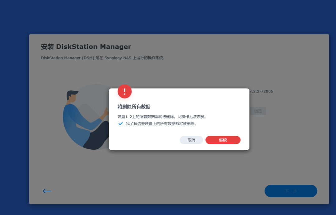 提示要将硬盘1、2数据清除,我们勾选同意,继续。