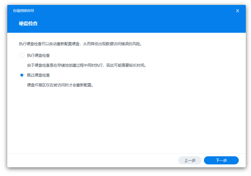 RAID模式选择,如果选择的是SHR,一般新手就可以选择SHR,当NAS里面只有一颗硬盘的时候,磁盘阵列的模式为basic,无数据保护。当再添加为一个硬盘的时候磁盘阵列的模式自动转换成类似raid1模式,空间大小不变,但是多了个数据保护。当再加入一个硬盘的时候会自动转换成类似raid5模式,当然了,你的NAS也要有支持3个盘位。