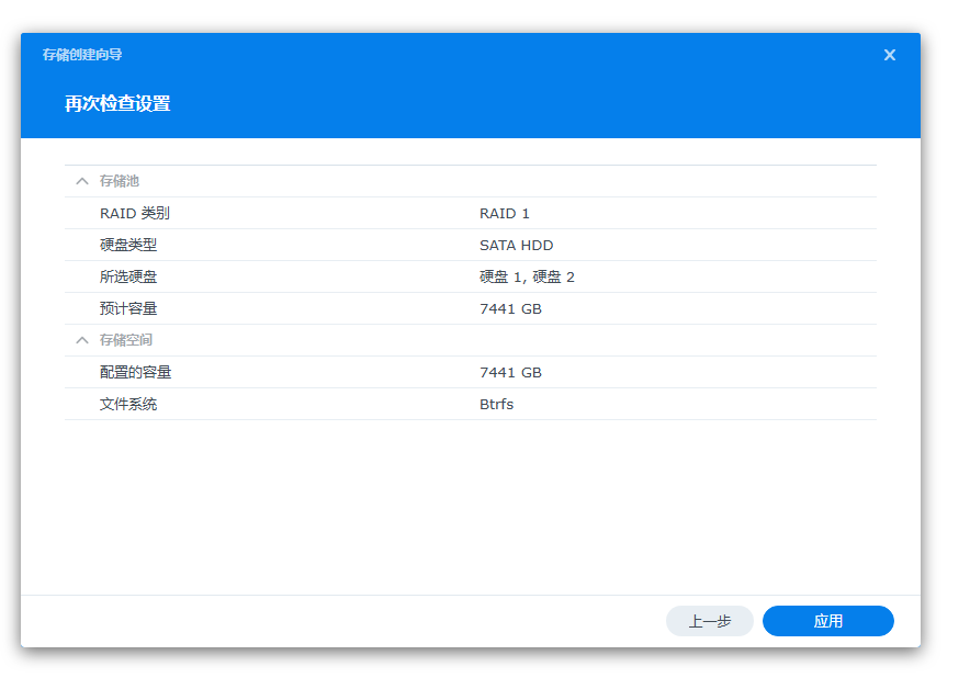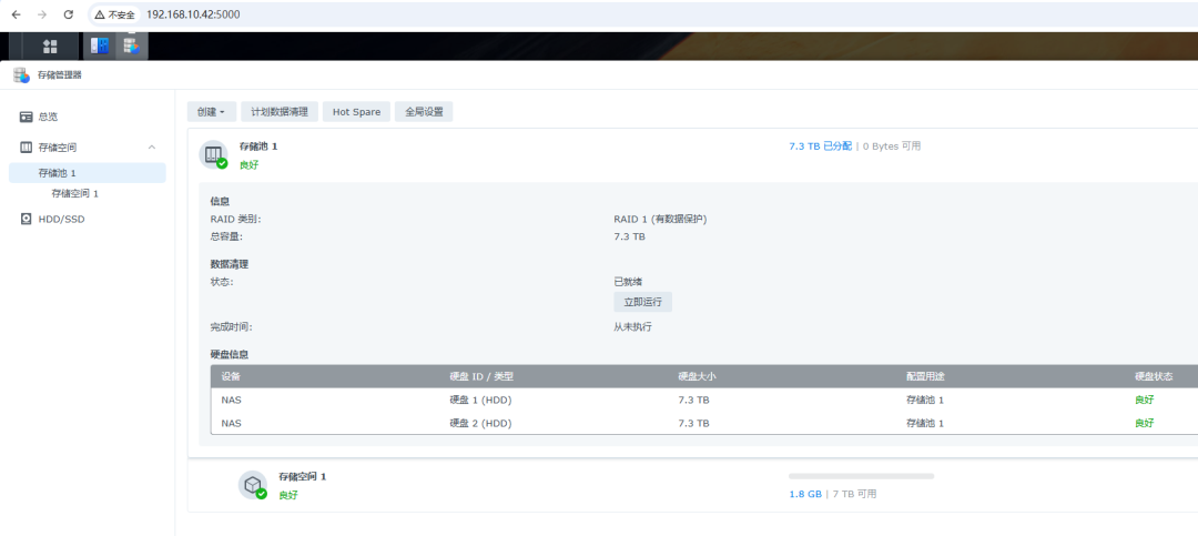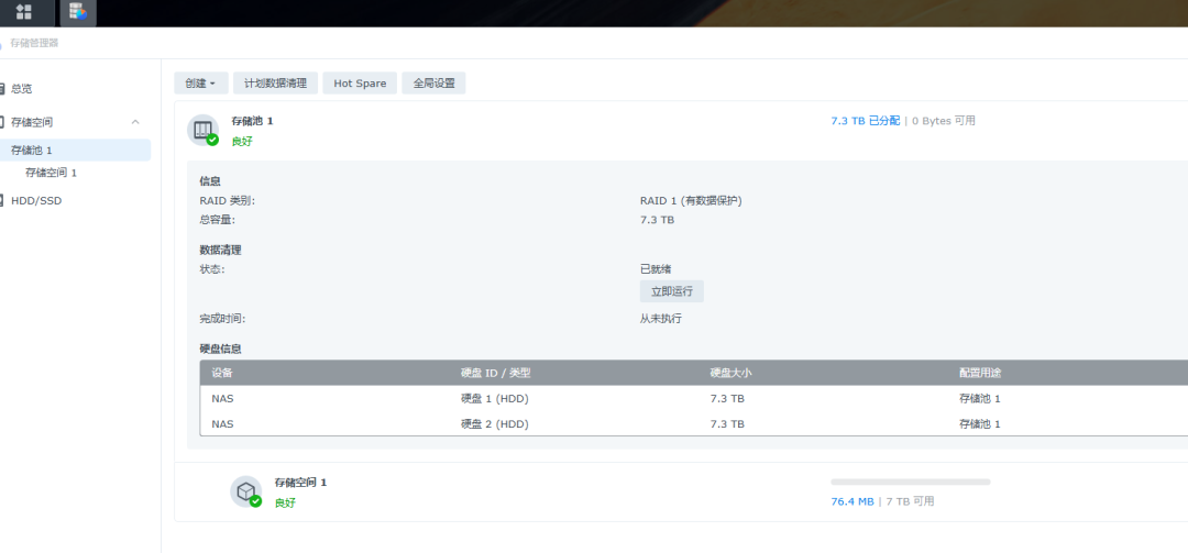 这时NAS设备的存储空间就划分好了,两块硬盘都已经添加完成,做的是RAID1。