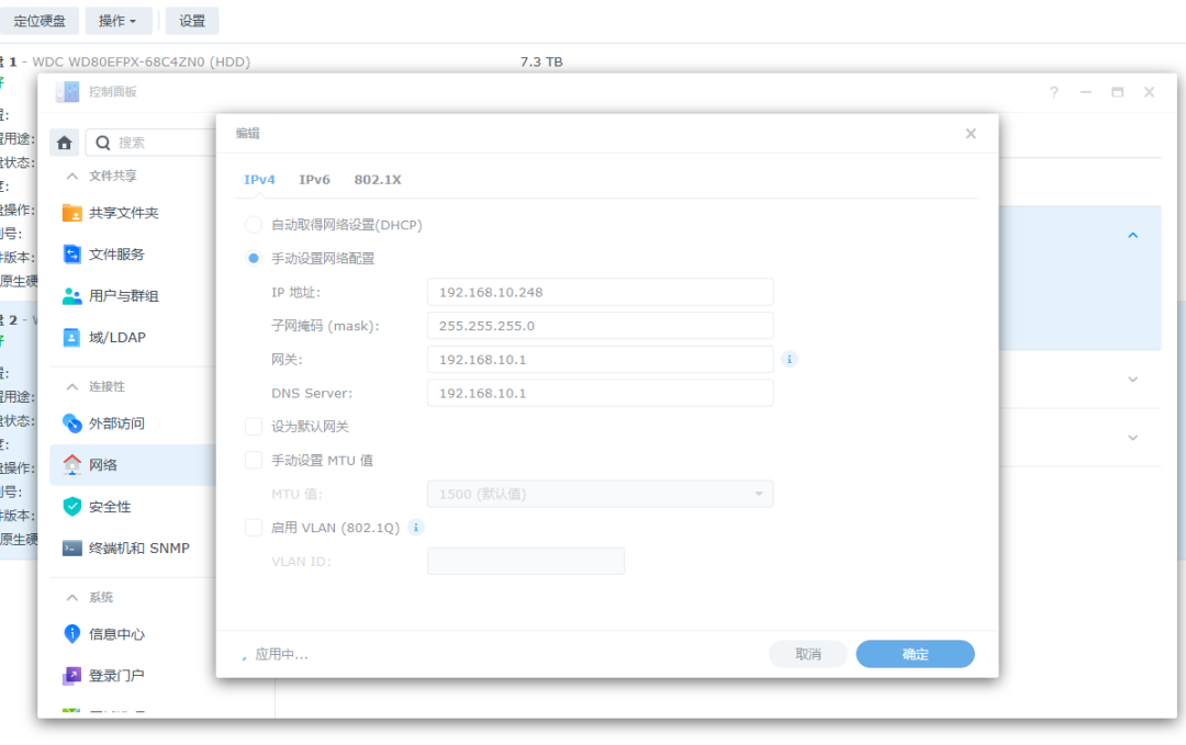 然后我们到NAS设备网络配置中,将NAS的IP地址设置为固定IP地址,192.168.10.248。避免以后有IP地址冲突。
