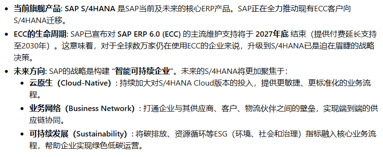 SAP(Systeme, Anwendungen und Produkte in der Datenverarbeitung,即“数据处理中的系统、应用和产品”)公司于1972年在德国魏恩海姆(Weinheim)成立。其创始人是五位前IBM公司的工程师:Dietmar Hopp, Hans-Werner Hector, Hasso Plattner, Klaus Tschira, 和 Claus Wellenreuther。他们的核心理念在当时是革命性的:开发能够实时处理业务数据的标准化商业软件。在那个年代,数据处理通常是批处理模式(Batch Processing),即数据被收集起来,在夜间或非高峰时段统一处理,管理者第二天才能看到报表。SAP的“实时(Real-time)”理念,旨在让企业在数据产生的那一刻就能进行处理和分析,为管理决策提供即时支持。这个初心贯穿了SAP产品演进的始终。SAP的ERP产品历程,是全球企业信息化发展的缩影,大致可以分为以下几个关键时代: 第一阶段:大型机时代 - 奠定基础 (1970s - 1980s) 第二阶段:客户端/服务器时代 - 称霸全球 (1990s) 第三阶段:互联网与平台化时代 - 延伸与整合 (2000s - 2010s) 第四阶段:内存计算与云时代 - 智能与简化 (2015年 - 至今)希望这份详尽的解读能够帮助您全面了解SAP ERP产品波澜壮阔的发展历程。
